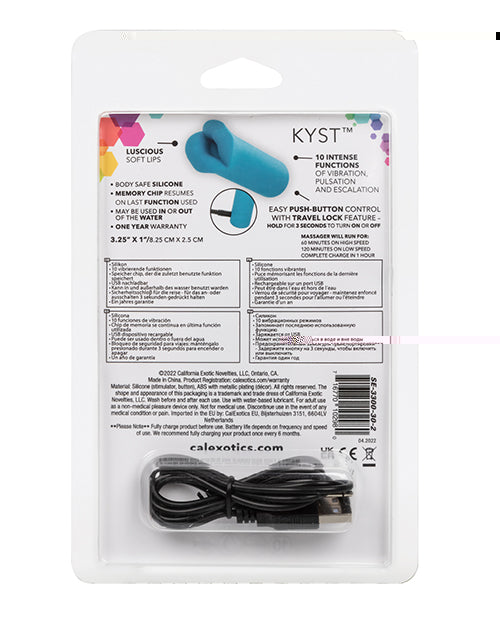 No matter where your travels take you, enjoy a little ?me time? with the Kyst? Lips mini massager. The powerful mini silicone bullet is packed with 10 functions of vibration and luscious, pliable lips. The mini massager fits between your fingers to let you deliver pinpoint tantalization and a thrilling kiss with rumbling vibrations. Get playful while you cycle through 10 indulgent vibration, pulsation and escalation functions with the easy-touch control button. The premium silicone and plushy soft lips are great for exploring sensual sweet spots and intimate pleasure points with ease. With a smooth shape and supple surface, you?ll be able to indulge in thrilling vibrations from any angle your desire. Charge up your passion in just 1 hour by plugging the provided USB cable into the self-sealing charging port on the base of the massager. Get playful with up to 120 minutes of vibrations with every charge. The slim massager's discreet size makes it the perfect travel companion, letting you embrace radiating pleasure wherever your fantasies take you.