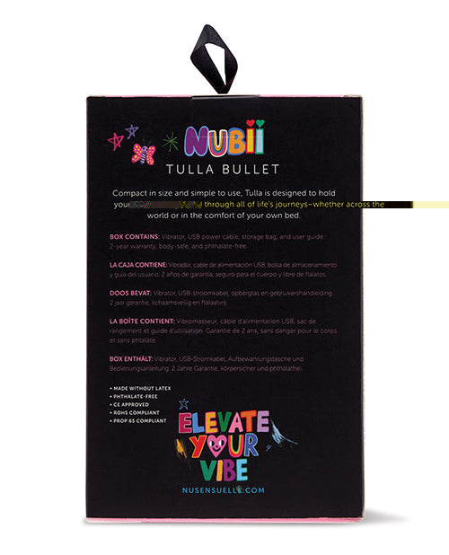 Joining the Nubii collection is Tulla-our rounded bullet with 10 vibrations. Compact and ergonomically designed, Tulla makes for the perfect travel companion. This beginner-friendly bullet will hold your hand through all life's journeys-whether across the world or in the comfort of your bed. Powered by the Nubii motor, this rechargeable bullet offers unparalleled power and the opportunity to grow alongside the Nu Sensuelle brand. Two Year Warranty.