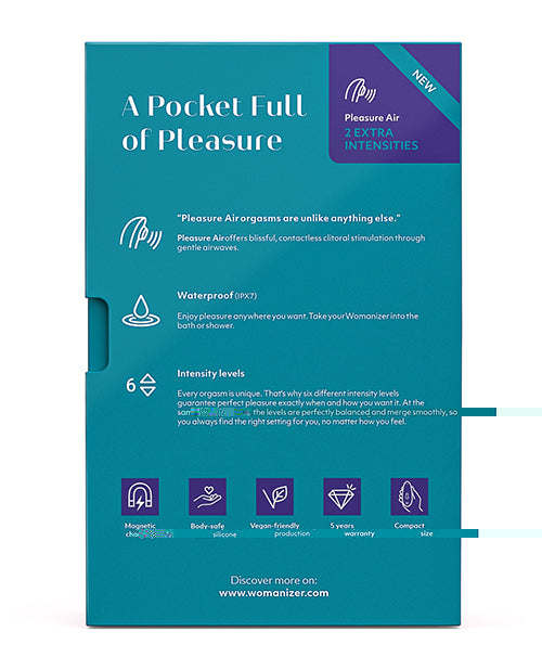 Compact sized clitoral stimulator for people seeking the unique sensations of Pleasure Air Technology. The new Womanizer STARLET 3 - it's the original Womanizer Pleasure Air Technology combined with five new vivid product colors and two more intensity levels, while it's still waterproof and USB rechargeable - for a reasonable price. 6 intensity levels - Every orgasm is unique. That's why six different intensity levels guarantee perfect pleasure exactly when and how you want it. The intensity levels are perfectly balanced and offer the right setting for your every mood. Body fit - The sensual, slim design fits comfortably in your hand and becomes the perfect companion for even the most intimate moments.?IPX7 Waterproof - You want to dive deeper? Since your WOMANIZER is IPX7 waterproof, nothing stands in the way of a long, relaxing bath, a refreshing shower or even a pool party. Materials : ABS plastic made without phthalates, BPA or latex. Dimensions : 117mm x 46mm x 47mm USB rechargeable - Run Time : 30 min Charge Time : 30 min Five Year Warranty.